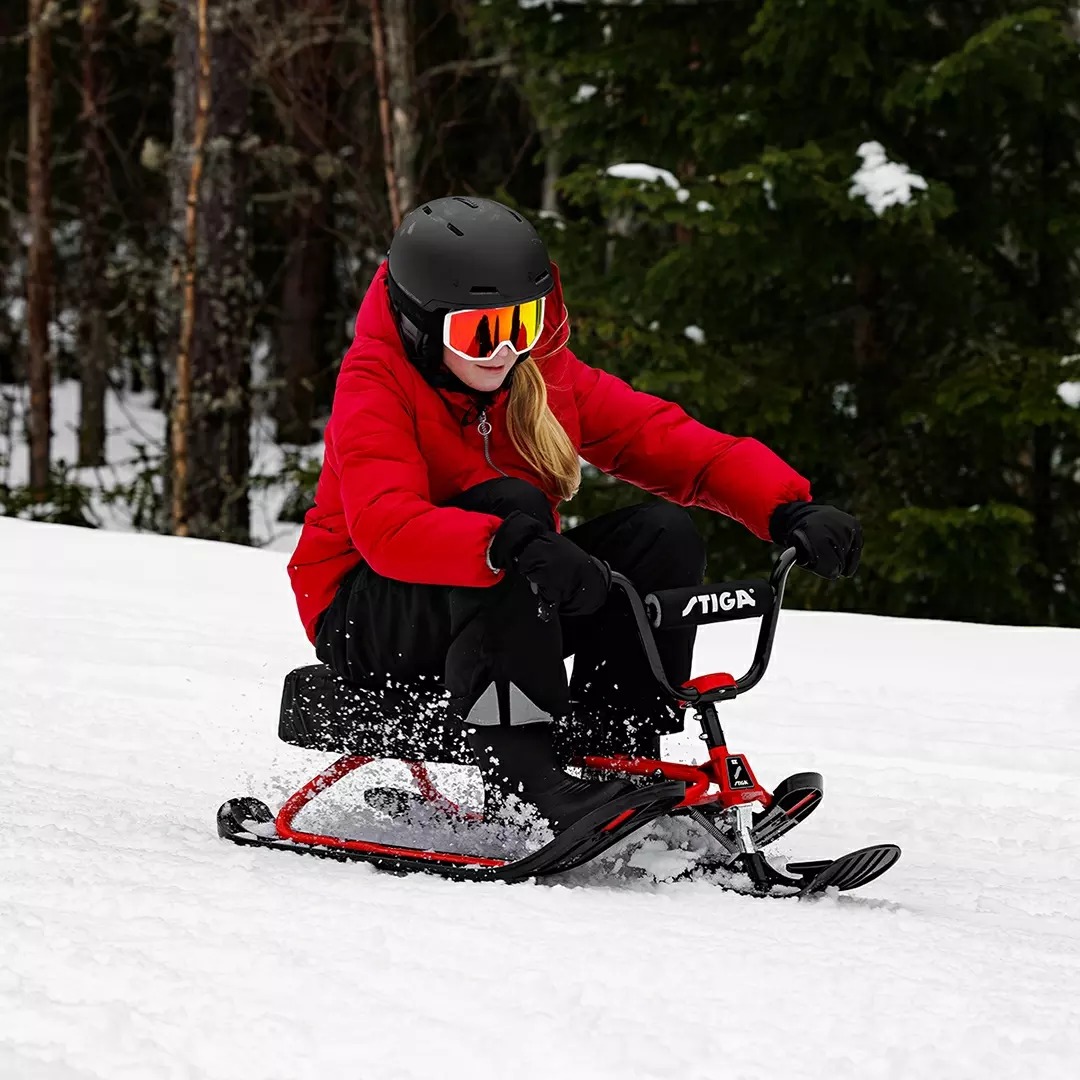STIGA Snowracer SX Pro offers the ultimate sledding experience! The sturdy, cool BMX handlebars elevate steering to a whole new level, making turns even more fun. Ideal for adventurous little riders. This SX Pro is equipped with a padded seatcover, the Curve Ski System, a sturdy steel frame that is very durable, a brake for safe riding, and an automatic winder to facilitate pulling. The Snowracer SX Pro can withstand a maximum user weight of 200 lbs, so even an adult can enjoy some fun in the snow.